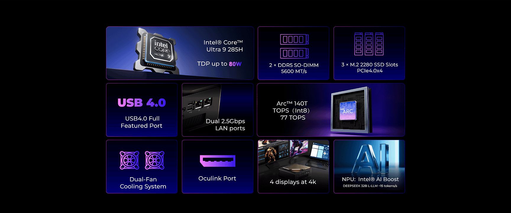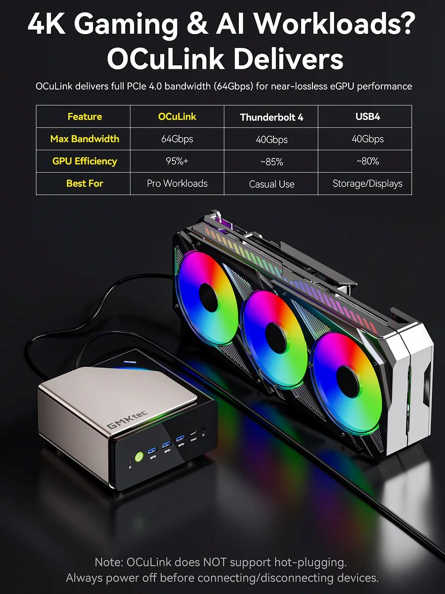 Kết nối Đột phá (OCuLink): Việc trang bị cổng OCuLink nó giải quyết điểm yếu lớn của Mini PC: hiệu năng đồ họa. Bằng cách cung cấp một kết nối PCIe băng thông cao, độ trễ thấp, OCuLink cho phép kết nối GPU bên ngoài (eGPU) với hiệu suất gần như cắm trực tiếp, vượt qua những giới hạn của Thunderbolt 4.