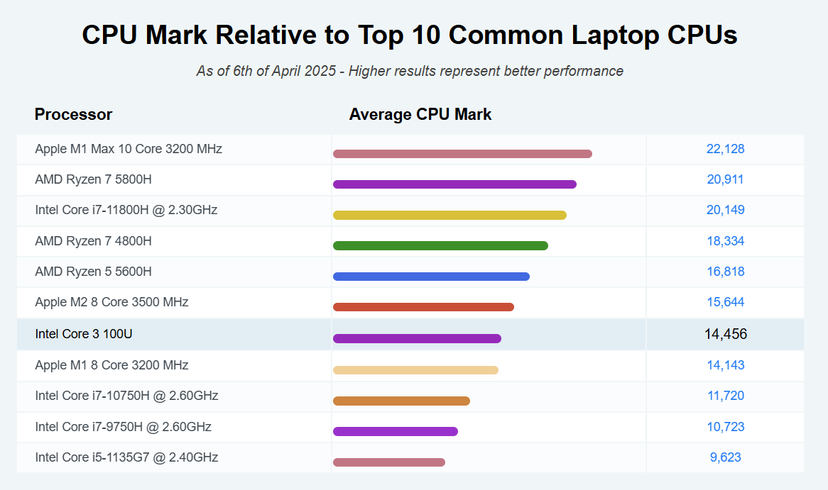 | CPU | Intel® Core™ 3-100U 6C/8T 4.7GHz CPU Mark |