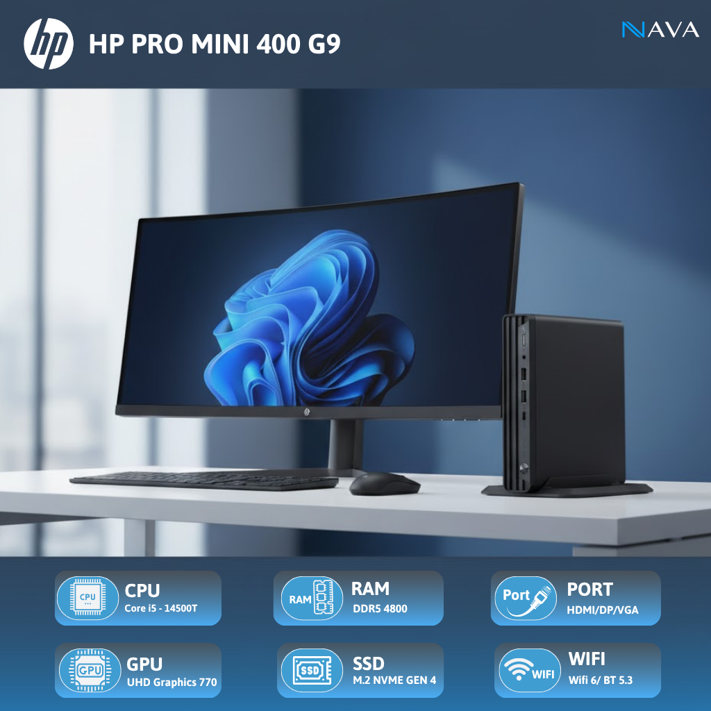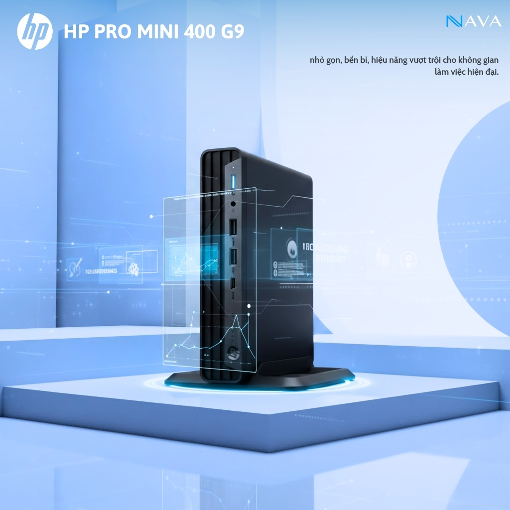 Kích thước vật lý là lợi thế cạnh tranh cốt lõi của HP Pro Mini 400 G9. Với kích thước chỉ 17.7 x 17.5 x 3.4 cm , thiết bị này chiếm rất ít không gian làm việc. Kích thước nhỏ gọn này không chỉ hỗ trợ thực hiện chính sách Bàn làm việc Gọn gàng (Clean Desk Policy) mà còn giúp tối đa hóa không gian trong các văn phòng hiện đại, nơi không gian cá nhân thường bị hạn chế.6 Hơn nữa, nhờ sử dụng CPU T-series tối ưu năng lượng, Mini PC này hoạt động rất êm ái, một yếu tố quan trọng trong các môi trường làm việc yêu cầu sự yên tĩnh cao.