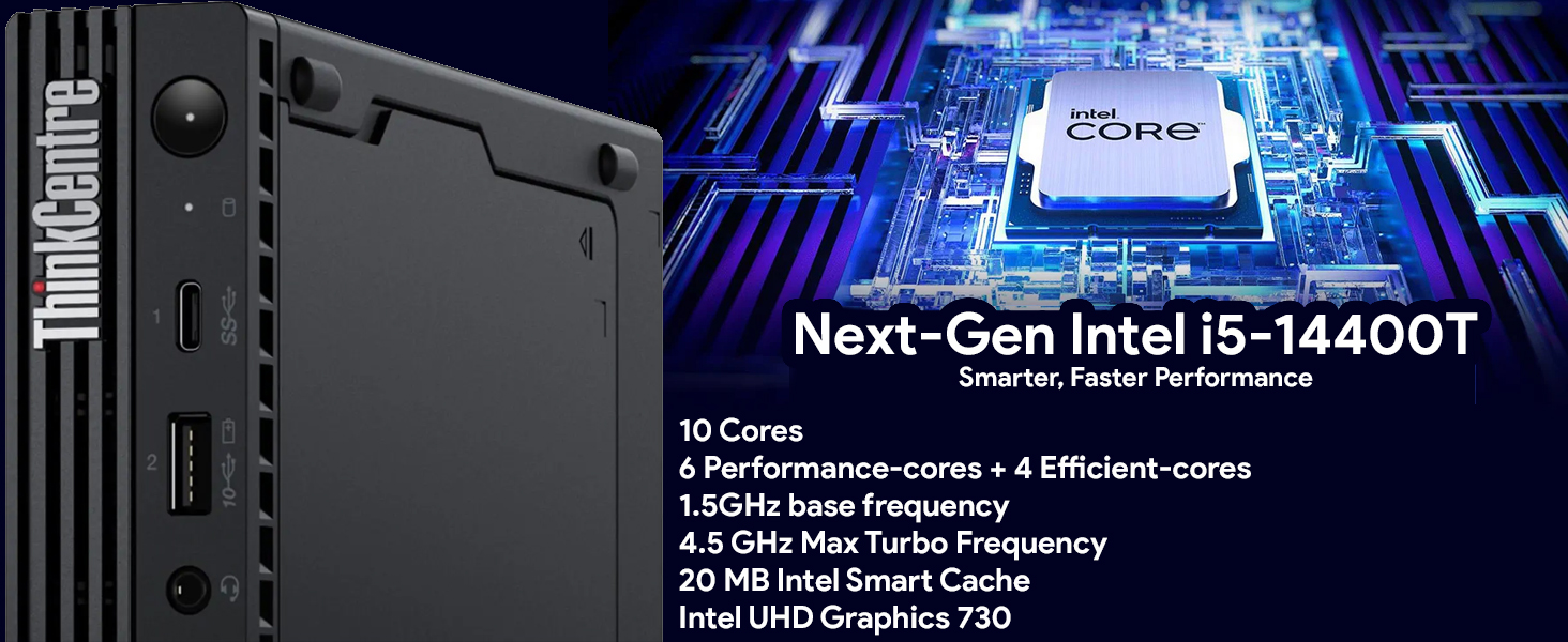 ThinkCentre M70q Gen 5 Tiny được trang bị các tùy chọn cấu hình mạnh mẽ, đặt nền móng cho khả năng xử lý các khối lượng công việc nặng. Thiết bị hỗ trợ các bộ vi xử lý Intel Core™ thế hệ thứ 14. đảm bảo hiệu suất xử lý đa luồng vượt trội cần thiết cho các ứng dụng chuyên nghiệp khắt khe.