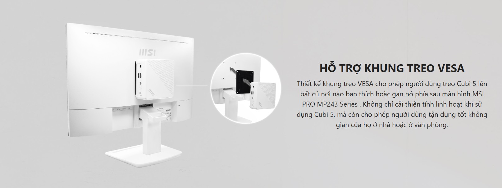 Cubi 5 12M hỗ trợ khung treo VESA tiêu chuẩn, cho phép người dùng gắn máy trực tiếp phía sau màn hình. Điều này ngay lập tức biến màn hình máy tính thông thường thành một Máy tính All-in-One (AIO) gọn gàng, loại bỏ hoàn toàn mớ dây cáp lộn xộn trên bàn làm việc. Sự linh hoạt này là chìa khóa cho các ứng dụng như: