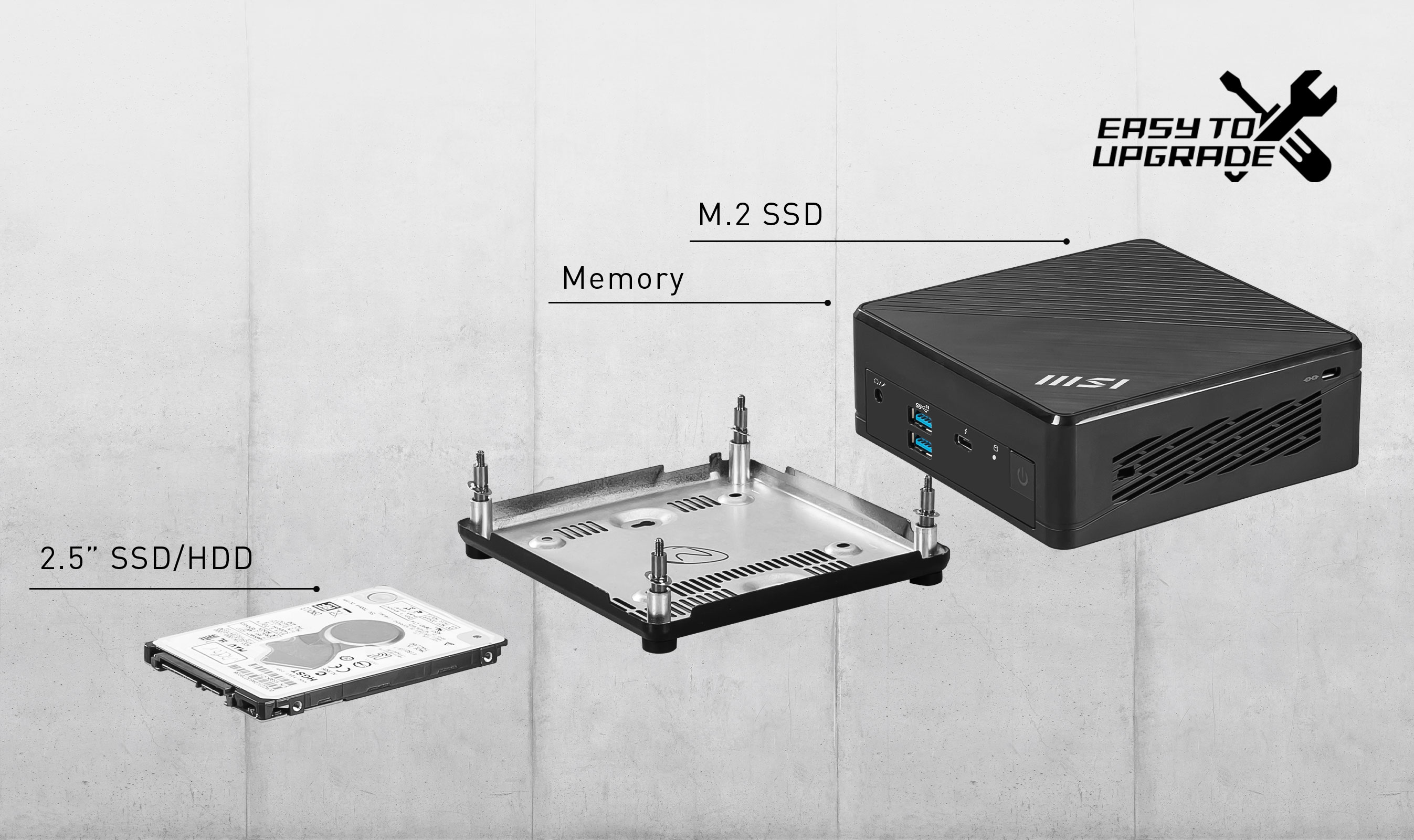 Một trong những ưu điểm lớn nhất của Cubi 5 12M là khả năng bảo trì. MSI thiết kế nắp dưới của máy có thể tháo rời một cách đơn giản, cho phép người dùng hoặc kỹ thuật viên dễ dàng truy cập và nâng cấp các bộ phận như RAM (hai khe SO-DIMM), ổ SSD M.2 hoặc ổ cứng 2.5 inch. Điều này không chỉ giảm thiểu lãng phí thời gian bảo trì mà còn giảm thiểu chi phí sở hữu tổng thể (TCO) cho doanh nghiệp.