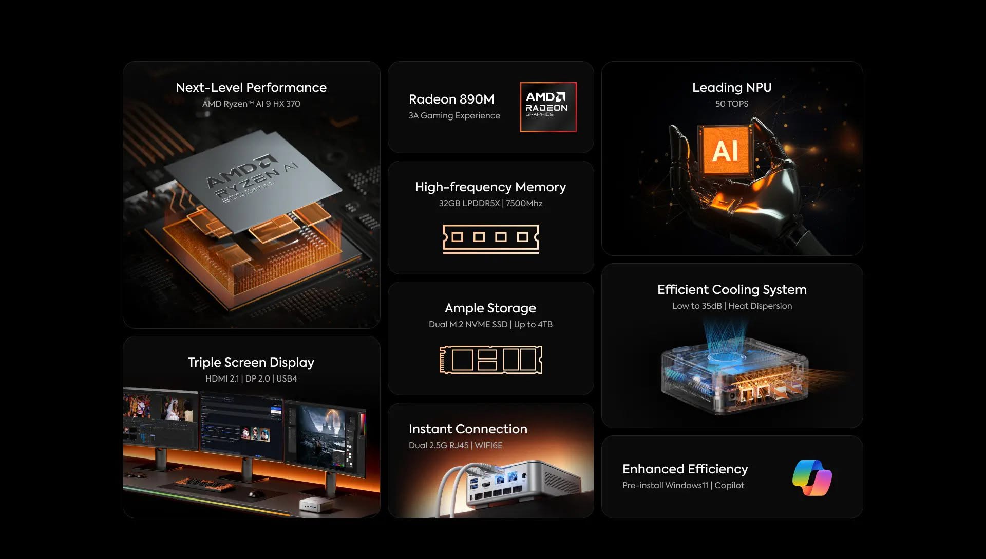 - iGPU Radeon 780M, tương đương cấu hình UM890, nhưng điểm độc đáo là hỗ trợ mở rộng phần cứng tối đa.