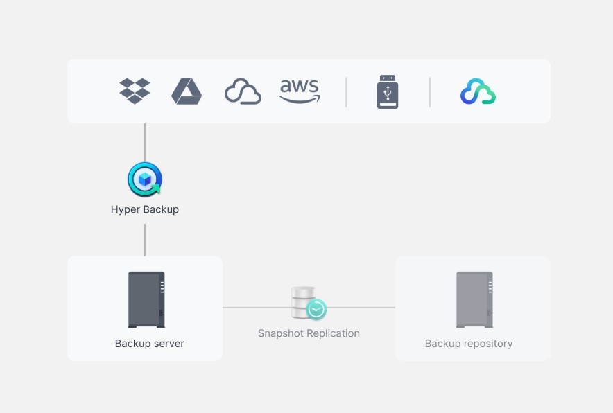 Hyper Backup: Được sử dụng để sao lưu toàn bộ dữ liệu trên NAS ra các đích ngoài, bao gồm ổ cứng gắn ngoài, NAS Synology thứ hai, hoặc các dịch vụ đám mây (Synology C2, S3). Hyper Backup là công cụ then chốt trong việc thực hiện chiến lược sao lưu 3-2-1.