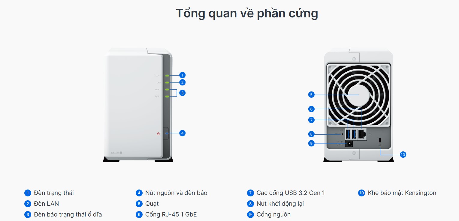 Là thiết bị 2 khay ổ cứng (2-Bay), DS223j hỗ trợ dung lượng lưu trữ thô tối đa lên đến 36 TB, đáp ứng nhu cầu lưu trữ tăng trưởng liên tục của các nhóm làm việc nhỏ hoặc thư viện đa phương tiện gia đình. Thiết bị tương thích với cả ổ cứng HDD SATA 3.5 inch và SSD SATA 2.5 inch (mặc dù yêu cầu thêm khay đỡ đĩa tùy chọn cho SSD). Về kết nối, DS223j được trang bị một cổng LAN RJ-45 1GbE và hai cổng USB 3.2 Gen 1, cho phép kết nối linh hoạt với mạng cục bộ và các thiết bị lưu trữ ngoại vi để sao lưu hoặc mở rộng tạm thời.
