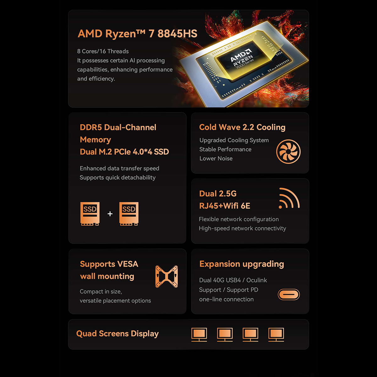 UM880 Pro được trang bị bộ vi xử lý AMD Ryzen 7 8845HS (thuộc dòng Zen 4), với 8 nhân, 16 luồng và tốc độ tối đa lên đến 5.1 GHz. Điều này giúp máy xử lý mượt mà các tác vụ đa nhiệm, chỉnh sửa video và chơi game nhẹ.
