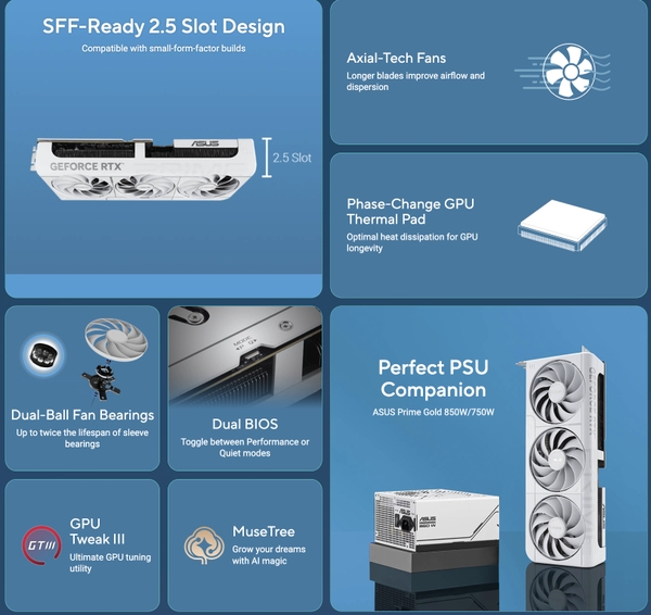 Trong thế giới linh kiện máy tính thường bị thống trị bởi màu đen và xám, phiên bản White Edition của dòng ASUS Prime mang đến một làn gió mới. Lớp vỏ ngoài (shroud) và tấm ốp lưng (backplate) đều được phủ một màu trắng sang trọng, tạo nên vẻ đẹp liền mạch và sạch sẽ.