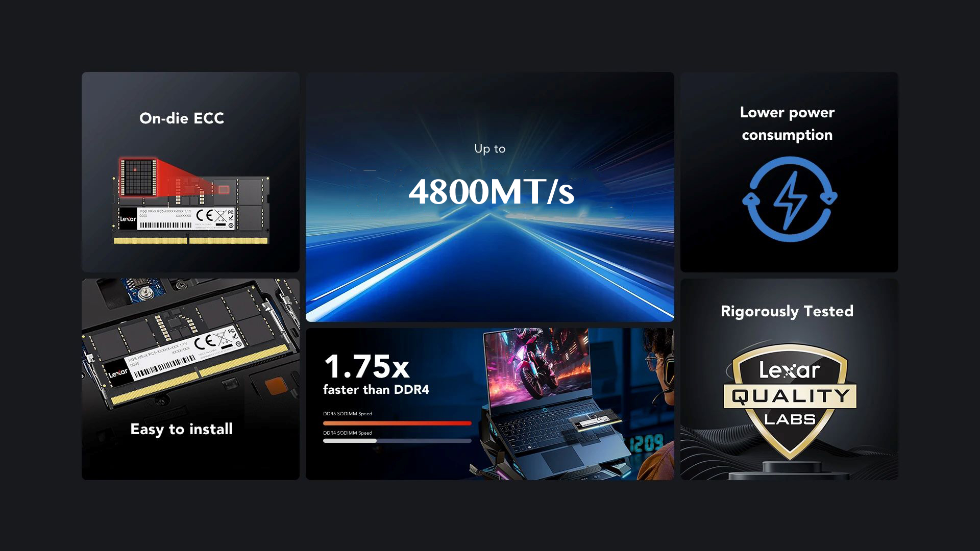 RAM Lexar DDR5 4800MT/s SODIMM được trang bị các tính năng công nghệ tiên tiến, mang lại hiệu suất làm việc và giải trí trên laptop một cách mượt mà và đáng tin cậy. Dưới đây là năm lợi ích cốt lõi khiến sản phẩm này trở thành lựa chọn nâng cấp hàng đầu.