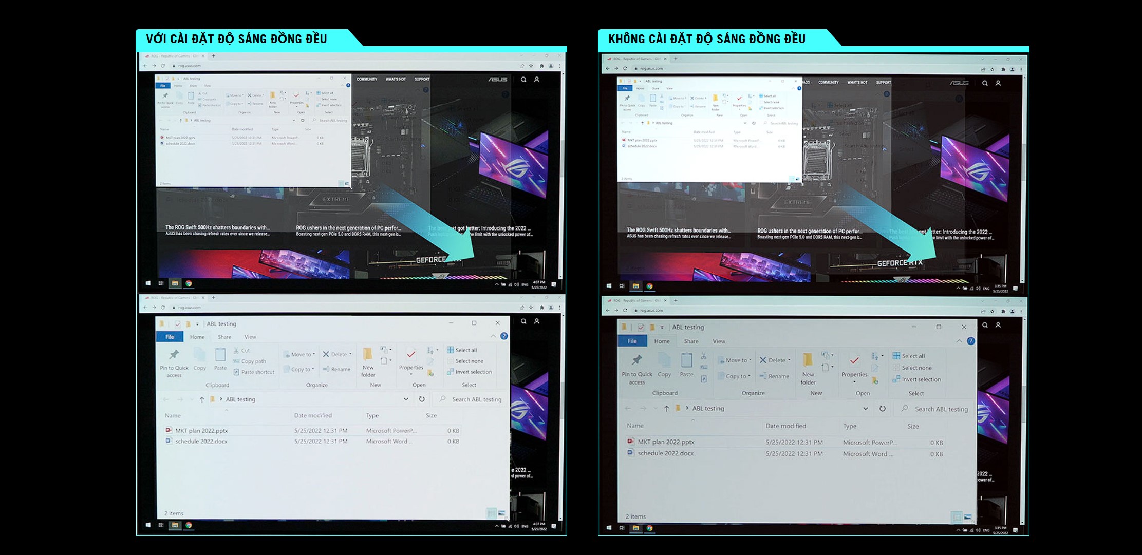 Một điểm cải tiến đáng giá trên PG27UCDM là tính năng Uniform Brightness (Độ sáng đồng nhất). Trên các màn hình OLED thông thường, độ sáng thường bị thay đổi tự động (ABL) dựa trên diện tích vùng trắng hiển thị, gây cảm giác khó chịu cho mắt.