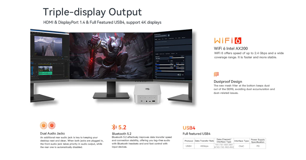 Hỗ trợ ba màn hình qua DP1.4 (4K 120Hz), HDMI (4K 120Hz) và USB4 (40Gbps/TBT3/PD/DP1.4), sản phẩm cho phép mở rộng không gian làm việc hoặc tạo trải nghiệm xem phim như rạp. Loa kép tích hợp cung cấp âm thanh lớn, chi tiết và sống động, nâng cao trải nghiệm giải trí đa phương tiện.