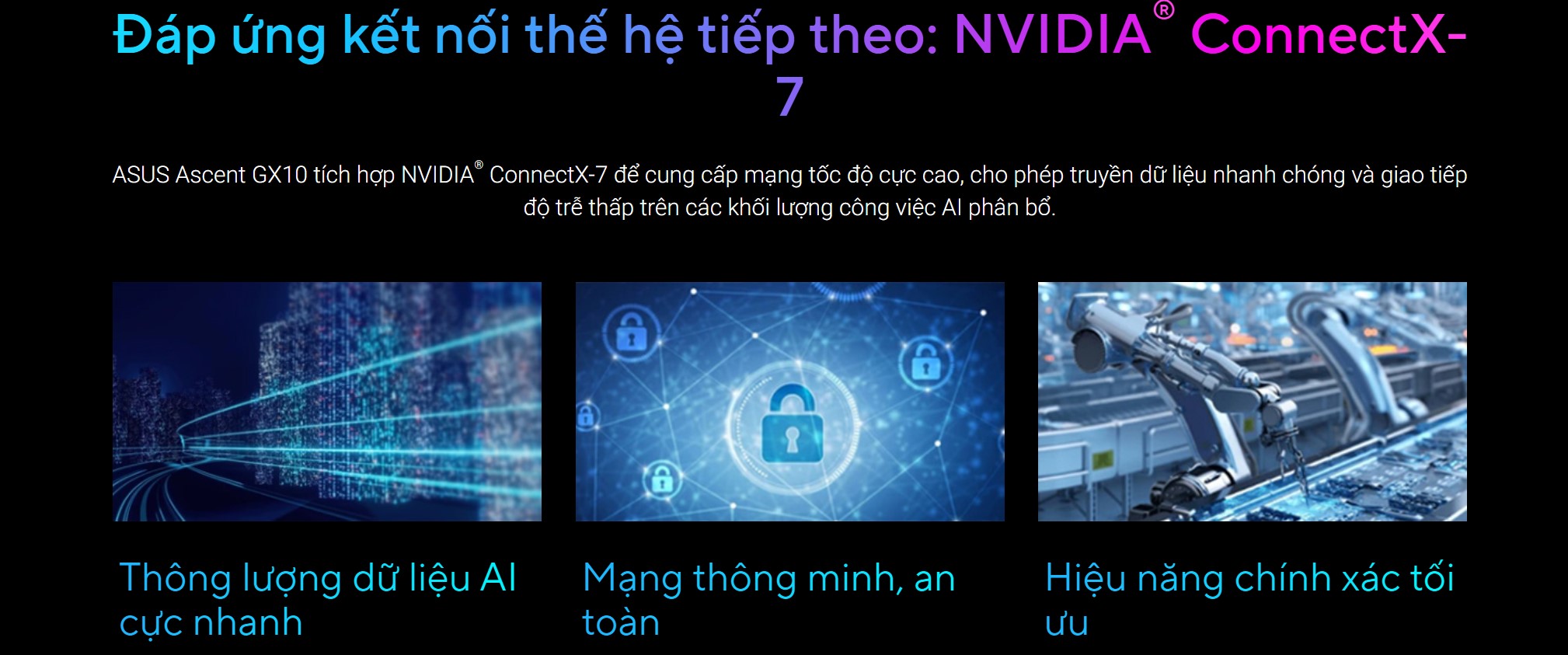 Sản phẩm hỗ trợ NVIDIA® ConnectX®-7, mang lại băng thông mạng lên đến 200Gb/giây, lý tưởng cho các khối lượng công việc AI phân bổ và quy mô lớn. Công nghệ này cho phép liên kết hai hệ thống ASUS Ascent GX10, mở rộng khả năng xử lý các mô hình AI lớn hơn, chẳng hạn như Llama 3.1 405B. ConnectX-7 tích hợp khả năng tăng tốc phần cứng cho TLS, IPsec, và MACsec, đảm bảo truyền dữ liệu an toàn mà không làm giảm hiệu suất CPU. Ngoài ra, hỗ trợ IEEE 1588v2 PTP mang lại khả năng đồng bộ hóa thời gian ở mức micro giây, đáp ứng các ứng dụng AI nhạy cảm với thời gian và điện toán biên.