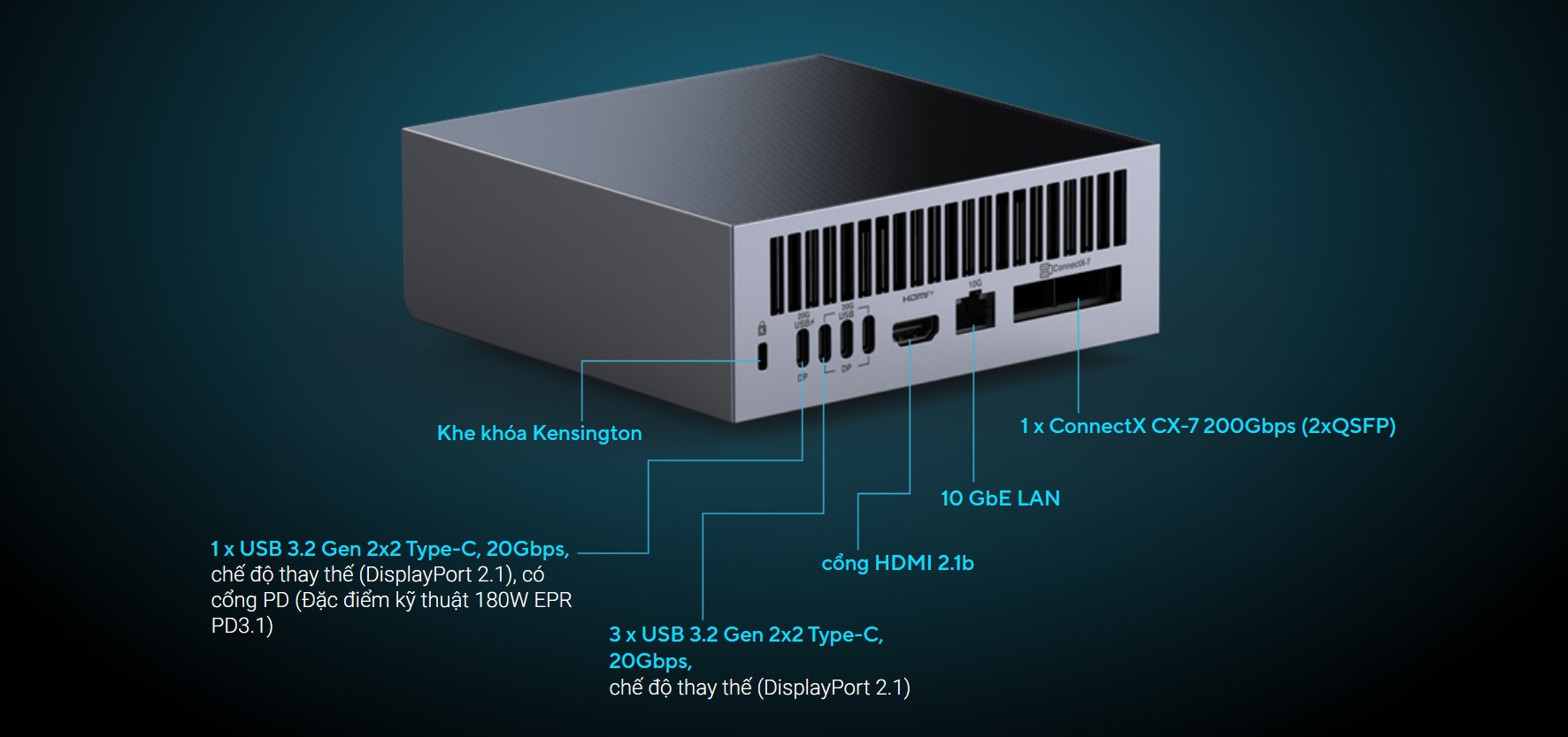 | Cổng IO | 4x Type-C 2x HDMI 2.1 1x ConnectX CX-7 (2x200G QSFP) 1x LAN 10G 1x Kensington Lock |