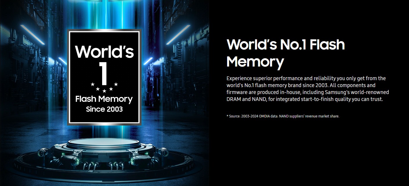 Samsung là thương hiệu số một thế giới về bộ nhớ flash từ năm 2003, tất cả các linh kiện, bao gồm cả DRAM và NAND nổi tiếng thế giới của Samsung, đều được sản xuất nội bộ, cho phép tích hợp từ đầu đến cuối cho chất lượng mà bạn có thể tin tưởng.