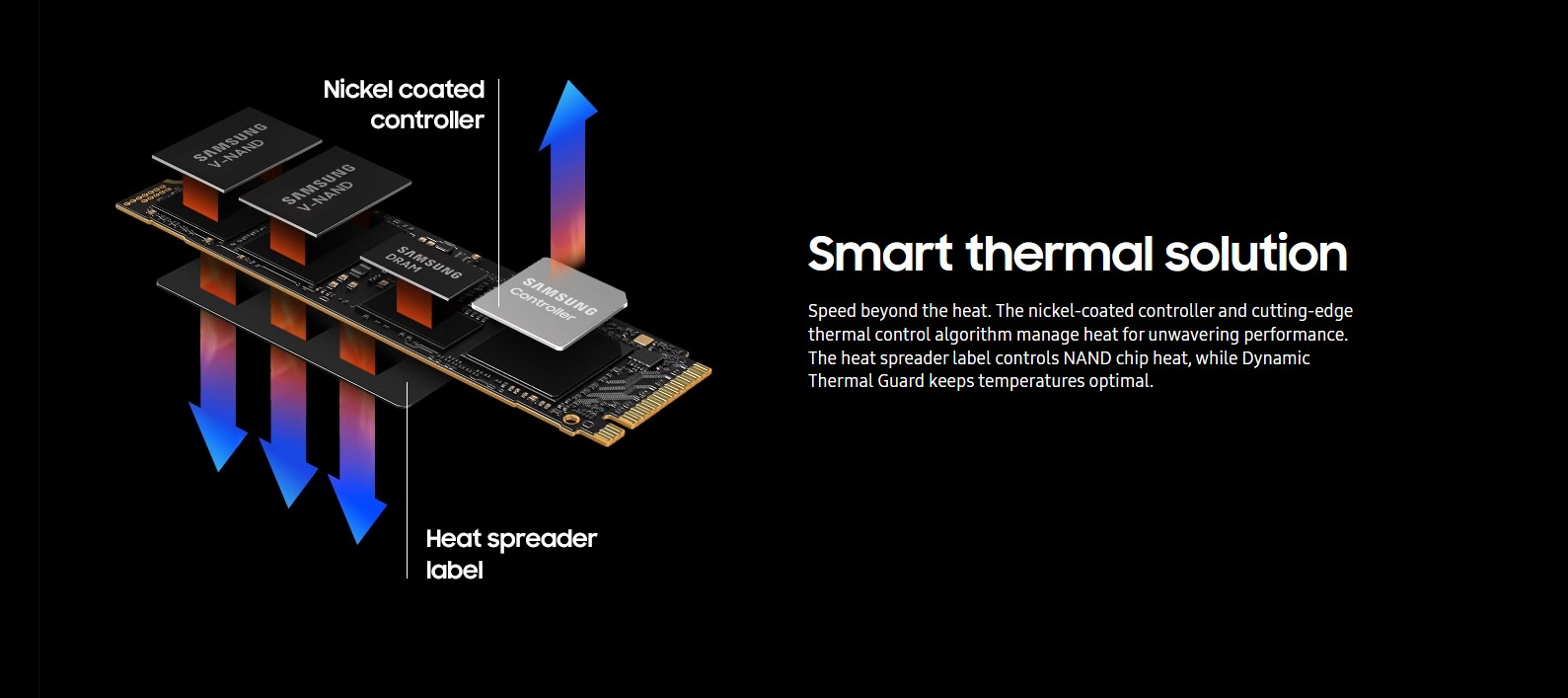 Đối với các dòng SSD có hiệu suất cao thường phải được trang bị tính năng kiểm soát nhiệt độ với độ tin cậy cao. Để đảm bảo hiệu suất ổn định, ổ cứng SSD Samsung 990 PRO PCIe NVMe M.2 2280 V-NAND được phủ lớp bọc Niken và sử dụng thuật toán điều khiển nhiệt cho hiệu suất ổn định để khả năng giải nhiệt hiệu quả hơn cho các chip NAND.
